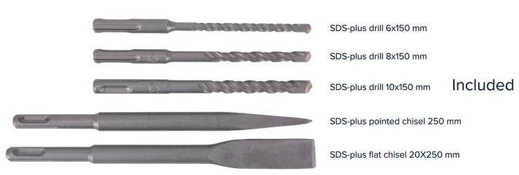 اندازه: دارای سه نظام اضافه ۳ عدد مته ۲ عدد قلم دارای شاسی چپگرد و راستگرد تنظیم در ۳ حالت دریل٬ تخریب و دریل چکشی